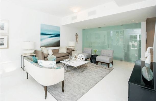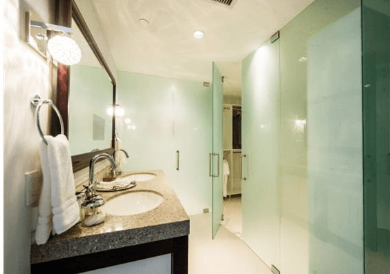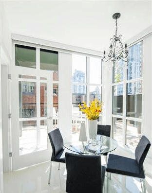 No two units within the building are exactly alike. But there are some features common to all. For instance, frosted glass doors are used in the entrance areas of the home and in bathroom areas to give an ultra-modern feel to closet areas while providing discreet storage for everything from coats and hot water tanks to washers and dryers.
