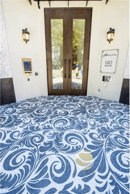 The building’s entrance sidewalk features dramatic black-and-white floral mosaic tiles, which are often photographed by passersby. The entrance of double high doors is framed with vertical marble tile pieces.